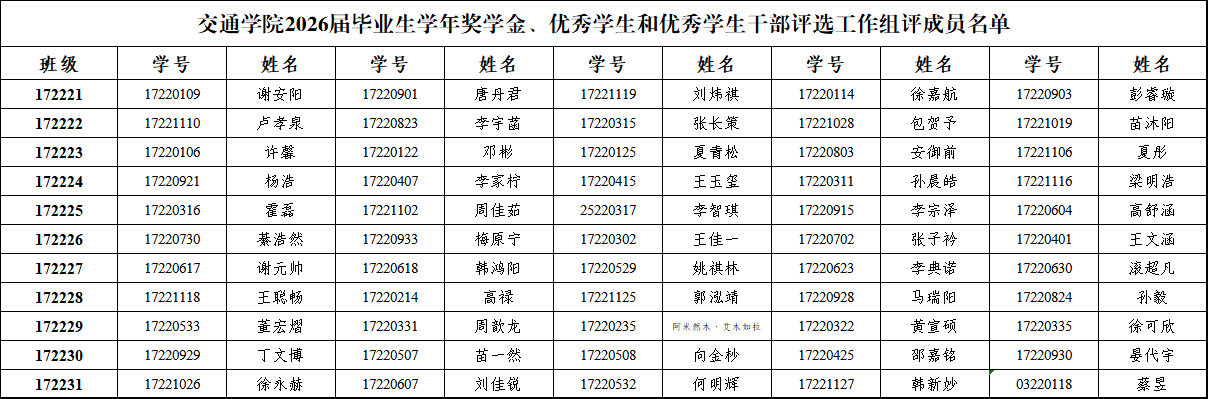 根据党委学生工作部《关于开展2026届毕业生学年奖学金、优秀学生和优秀学生干部评选工作的通知》相关要求,性奴 按照班级为单位成立组评小组(小组成员一般由学生党员、学生干部、学生代表组成,总人数不少于5人,其中设组长1人)。现将2026届毕业生学年奖学金、优秀学生和优秀学生干部评选工作组评小组成员名单公布如下(各组评小组首位为组长)。
